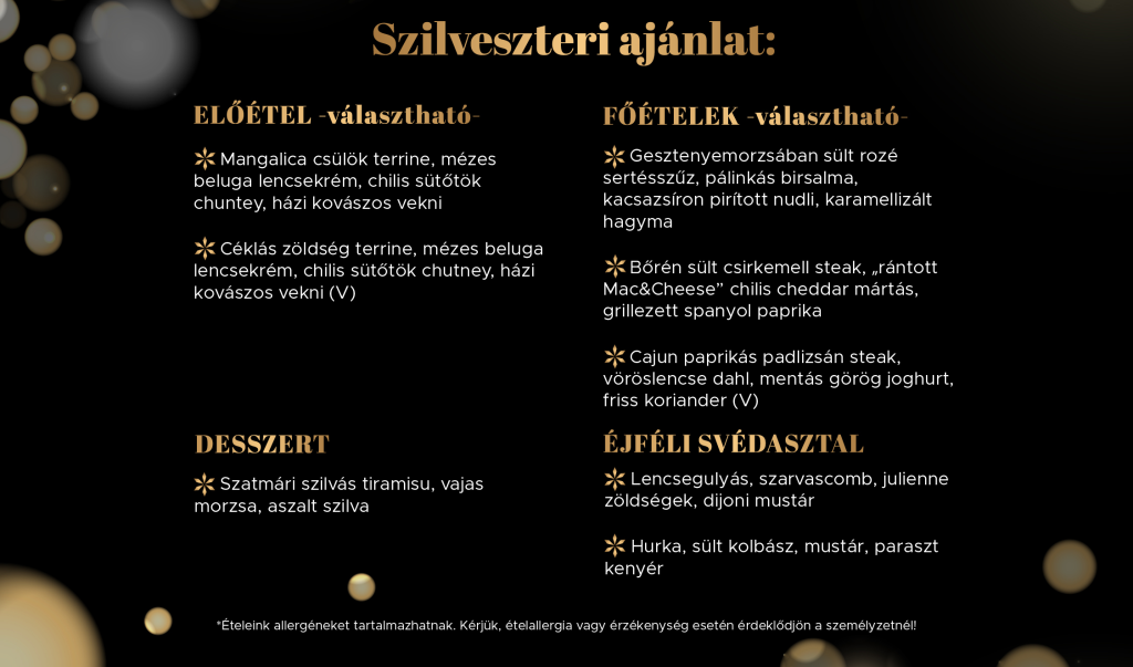 A jegy korlátlan prosecco-fogyasztást, választható ünnepi menüt és éjféli svédasztalt tartalmaz. Elegáns környezet, jó hangulat, remek ízek – így köszöntsük együtt az új évet!