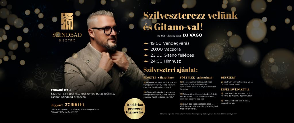 Várunk egy felejthetetlen óévbúcsúztató estére, ahol DJ Vágó gondoskodik a zenéről, Gitano pedig élő fellépéssel varázsolja különlegessé az éjszakát.